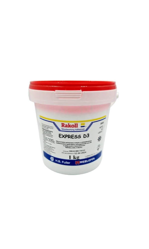 Klej wiąże bardzo szybko, w przypadku prasowaniu na gorąco można uzyskać krótkie czasy prasowania. Zastosowanie kleju Rakoll Express D3 powoduje, że połączenia klejowe będą miały dużą odpornością termiczną. Natomiast obróbka maszynowa połączeń klejowych wykazuje bardzo niewielkie zużycie narzędzi.