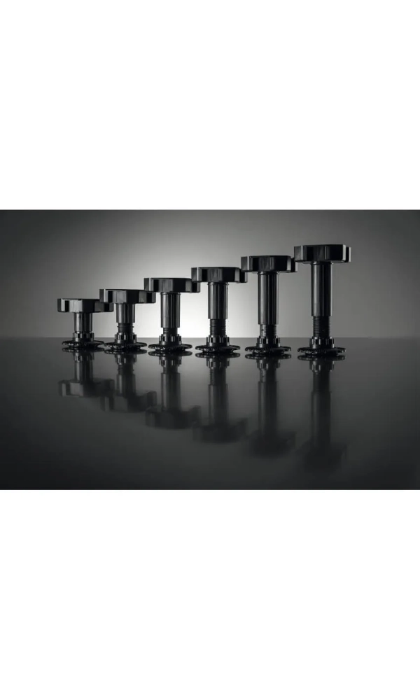 Nóżki HAFELE AXILO mają wytrzymałość do 150kg i są wykonane z trwałego tworzywa. Każda nóżka posiada pewny zakres regulacji. Axilo służy do szybkiego i pewnego poziomowania mebli na nierównym podłożu.