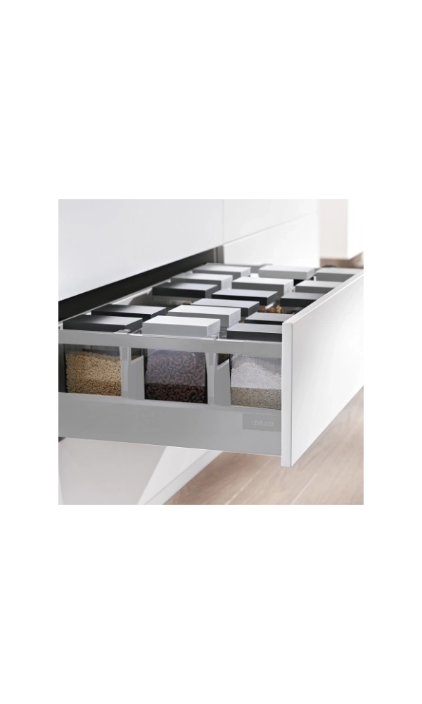 Reling BLUM ANTARO ZRG.437, 500 mm, do szuflady średniej i wysokiej. Kolor szary. Estetyczne wykończenie i stabilność. Komplet lewy + prawy.