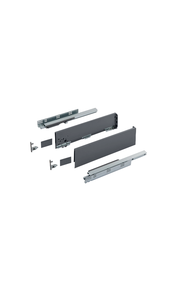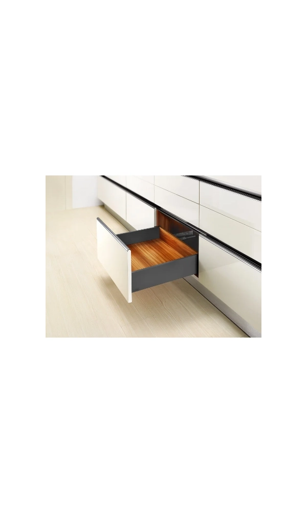 Szuflady z serii Slim Box to nowoczesne systemy o cienkich ściankach bocznych, które zapewniają elegancki wygląd mebli i maksymalne wykorzystanie przestrzeni wewnętrznej. Płynne i ciche domykanie nawet przy dużym obciążeniu.