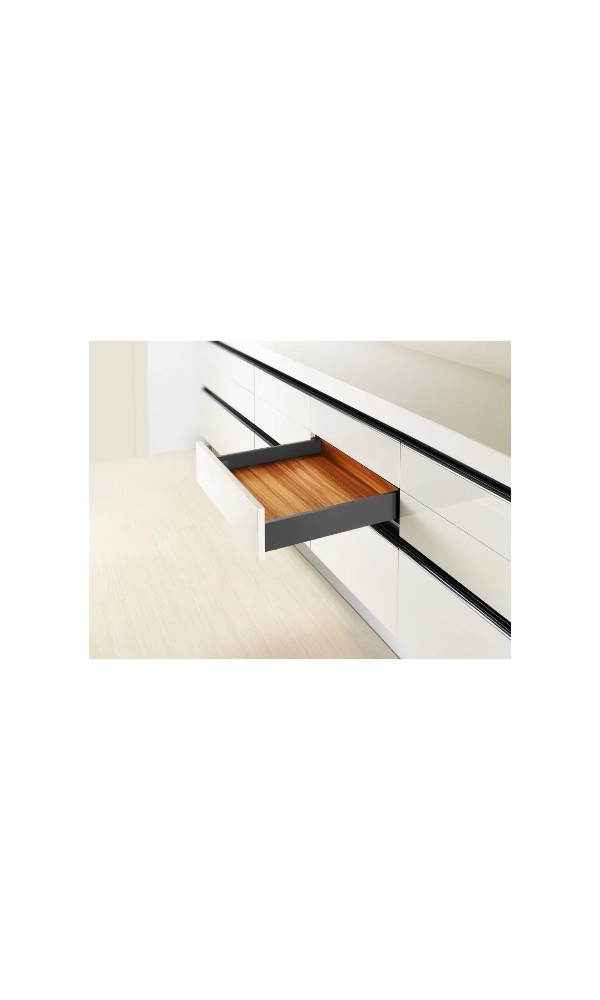 Szuflady z serii Slim Box to nowoczesne systemy o cienkich ściankach bocznych, które zapewniają elegancki wygląd mebli i maksymalne wykorzystanie przestrzeni wewnętrznej. Płynne i ciche domykanie nawet przy dużym obciążeniu.
