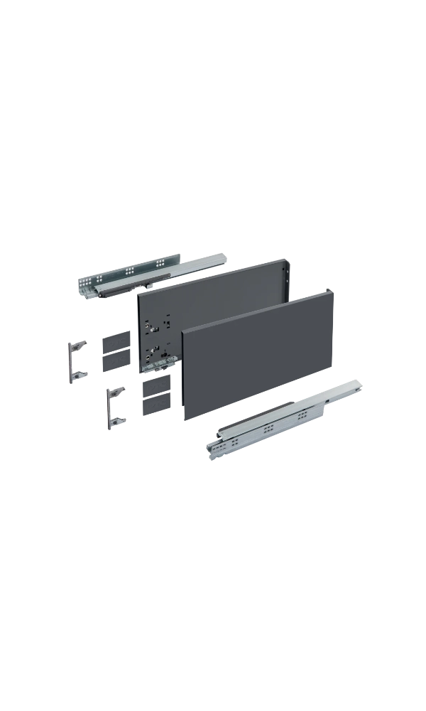 Szuflady z serii Slim Box to nowoczesne systemy o cienkich ściankach bocznych, które zapewniają elegancki wygląd mebli i maksymalne wykorzystanie przestrzeni wewnętrznej. Płynne i ciche domykanie nawet przy dużym obciążeniu.