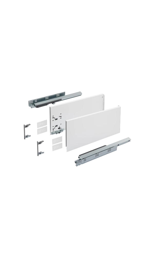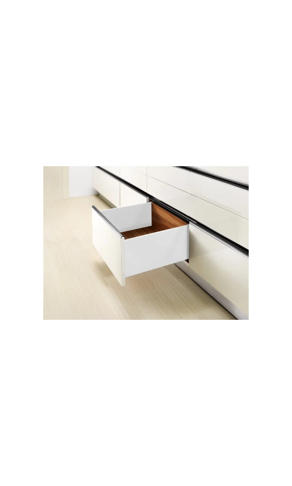 Szuflady z serii Slim Box to nowoczesne systemy o cienkich ściankach bocznych, które zapewniają elegancki wygląd mebli i maksymalne wykorzystanie przestrzeni wewnętrznej. Płynne i ciche domykanie nawet przy dużym obciążeniu.