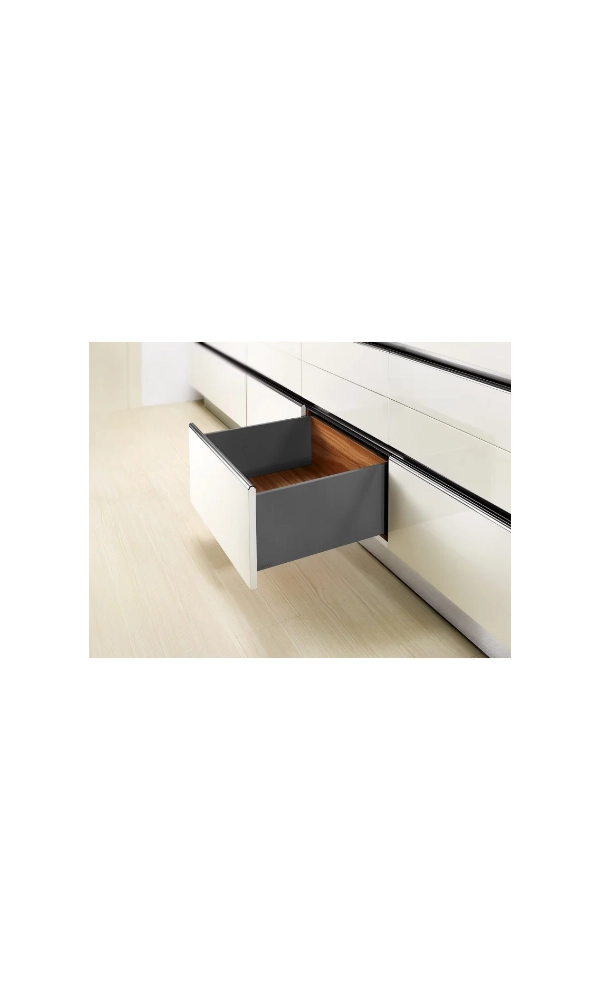 Szuflady z serii Slim Box to nowoczesne systemy o cienkich ściankach bocznych, które zapewniają elegancki wygląd mebli i maksymalne wykorzystanie przestrzeni wewnętrznej. Płynne i ciche domykanie nawet przy dużym obciążeniu.