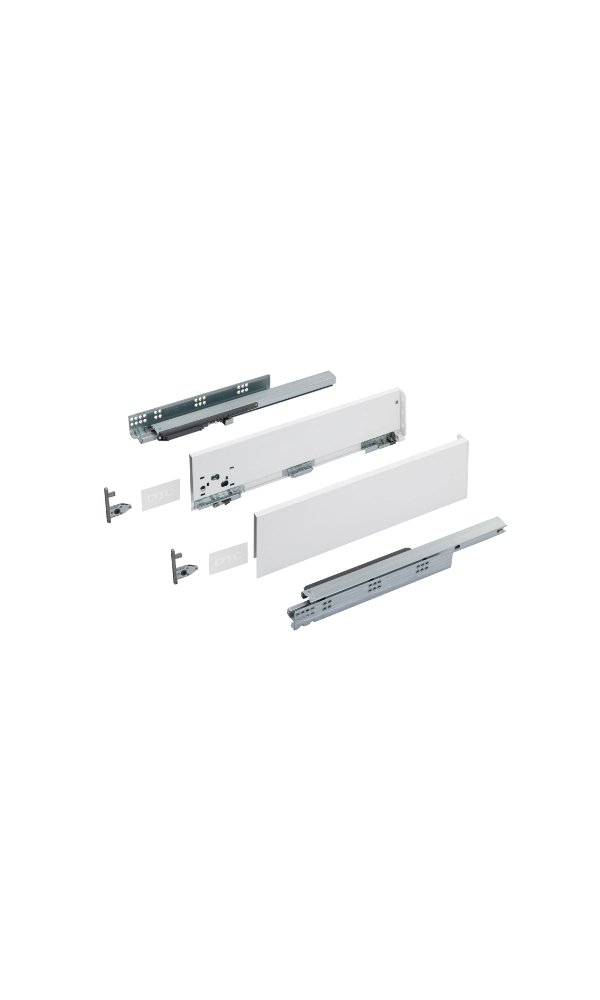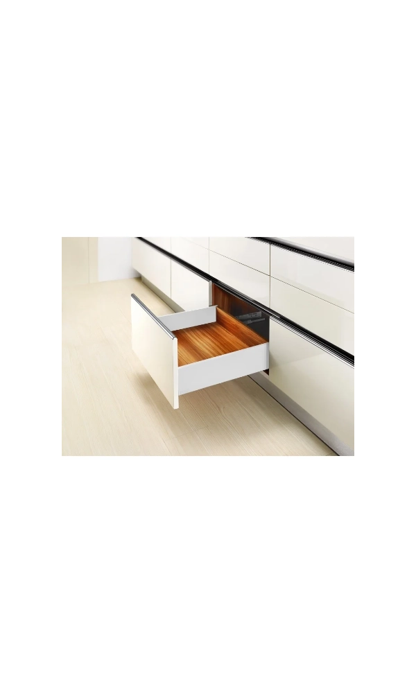 Szuflady z serii Slim Box to nowoczesne systemy o cienkich ściankach bocznych, które zapewniają elegancki wygląd mebli i maksymalne wykorzystanie przestrzeni wewnętrznej. Płynne i ciche domykanie nawet przy dużym obciążeniu.